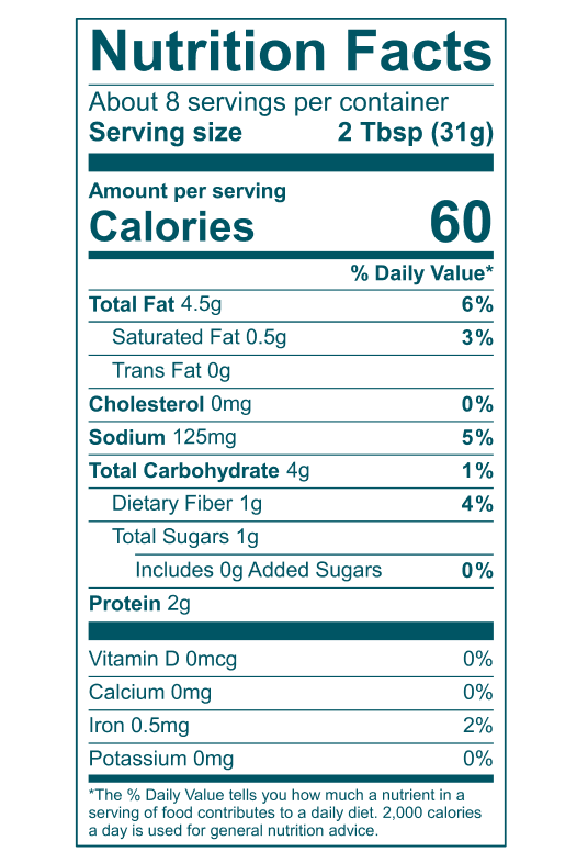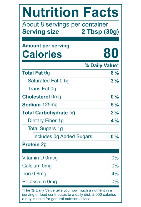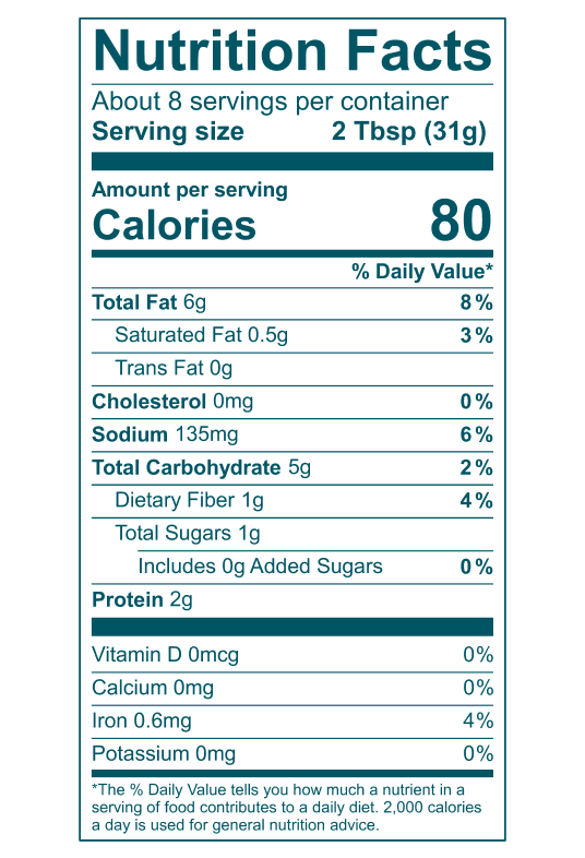 Organic Tahini (Sesame Seeds), Water, Organic Fresh Squeezed Lemon Juice, Organic Sunflower Oil, Roasted Garlic, Organic Extra Virgin Olive Oil, Organic Sea Salt, Organic Date Molasses (Organic Dates)